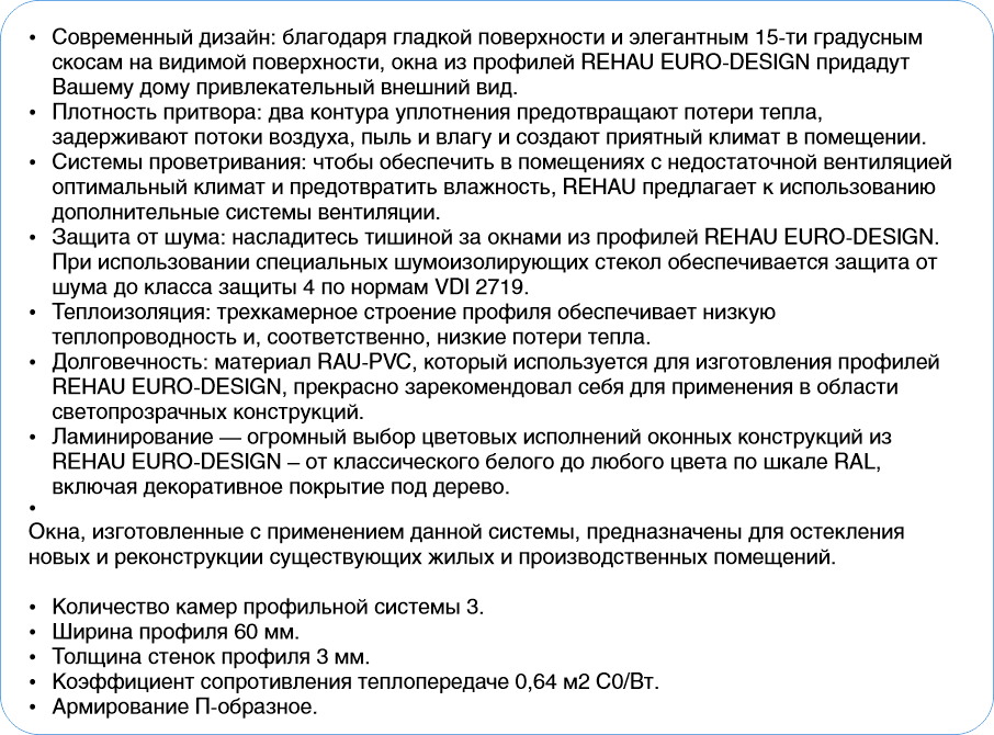 Данная система – идеальное соотношение высокого качества REHAU и невысокой цены. Трехкамерные профили REHAU EURO-DESIGN полностью соответствуют мировым и российским требованиям по термоизоляции и звукопоглощению.